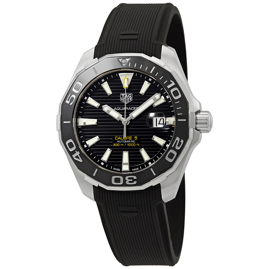 Silver-tone stainless steel case with a black rubber strap. Uni-directional rotating black ceramic bezel. Black dial with silver-tone hands and index hour markers. Minute markers around the outer rim. Dial Type: Analog. Luminescent hands and markers. Date display at the 3 o'clock position. TAG Heuer Calibre 5 Automatic movement, based upon ETA 2824-2, containing 26 Jewels, bitting at 28800 vph, and has a power reserve of approximately 38 hours. Scratch resistant sapphire crystal. Screw down crown. Solid case back. Round case shape, case size: 43 mm. Fold over clasp. Water resistant at 300 meters / 1000 feet. Functions: date, hour, minute, second. Aquaracer Series. Dive watch style. Watch label: Swiss Made. Tag Heuer Aquaracer Automatic Black Dial Mens Watch WAY201A.FT6142.