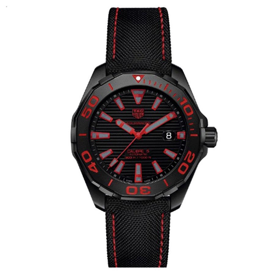 Black PVD titanium case with a black nylon strap. Uni-directional rotating black PVD titanium bezel with a black ceramic ring. Black dial with luminous red hands and index hour markers. Minute markers around the outer rim. Dial Type: Analog. Luminescent hands and markers. Date display at the 3 o'clock position. Caliber 5 automatic movement with a 38-hour power reserve. Scratch resistant sapphire crystal. Screw down crown. Solid case back. Dodecagon case shape. Case size: 43 mm. Case thickness: 12 mm. Band width: 21 mm. Deployment clasp. Water resistant at 300 meters / 1000 feet. Functions: date, hour, minute, second. Calibre 5 Series. Sport watch style. Watch label: Swiss Made. Tag Heuer Calibre 5 Automatic Black Dial Mens Watch WAY208A.FC6381.