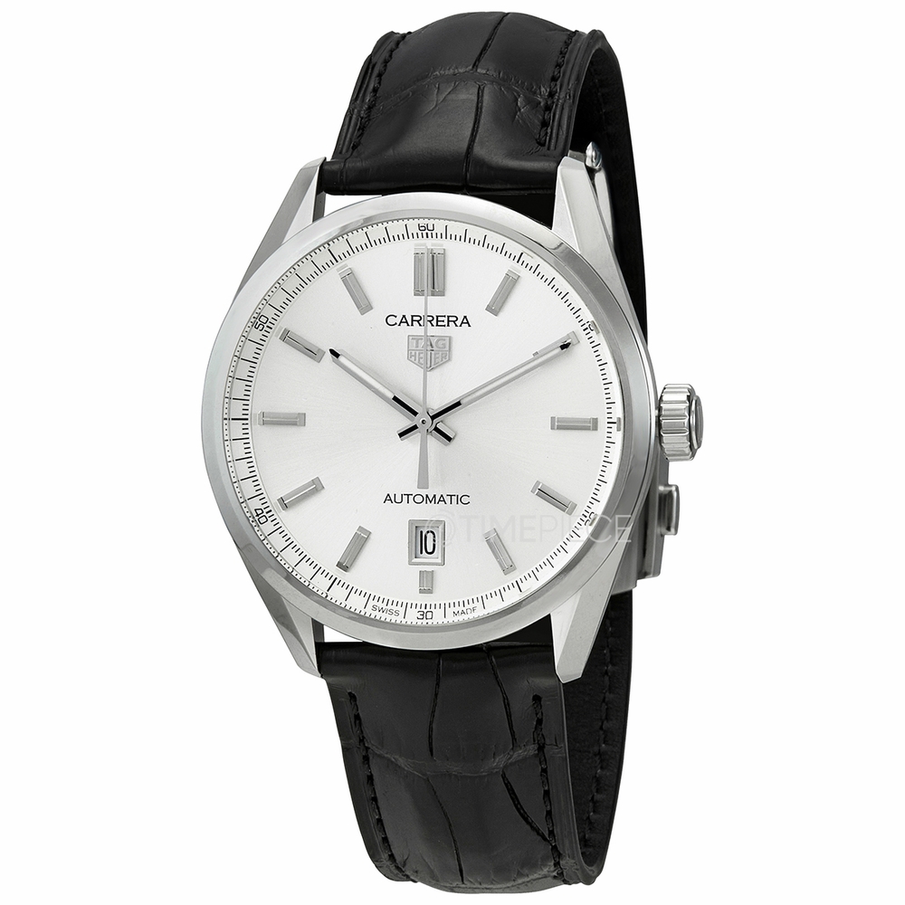 Stainless steel case with a black (alligator) leather strap. Fixed stainless steel bezel. Grey dial with luminous silver-tone hands and index hour markers. Arabic numeral minute markers (at 10 minute intervals). Minute markers around the outer rim. Dial Type: Analog. Luminescent hands and markers. Date display above the 6 o'clock position. TAG Heuer calibre 5 automatic movement, based upon ETA 2824-2, containing 26 Jewels, bitting at 28800 vph, and has a power reserve of approximately 38 hours. Scratch resistant sapphire crystal. Pull / push crown. Transparent case back. Round case shape. Case size: 39 mm. Case thickness: 11.50 mm. Band width: 20.5 mmn. Fold over clasp. Water resistant at 100 meters / 330 feet. Functions: date, day, hour, minute, second. Carrera Series. Luxury watch style. Watch label: Swiss Made. Tag Heuer Carrera Automatic Grey Dial Mens Watch WBN2111.FC6505.