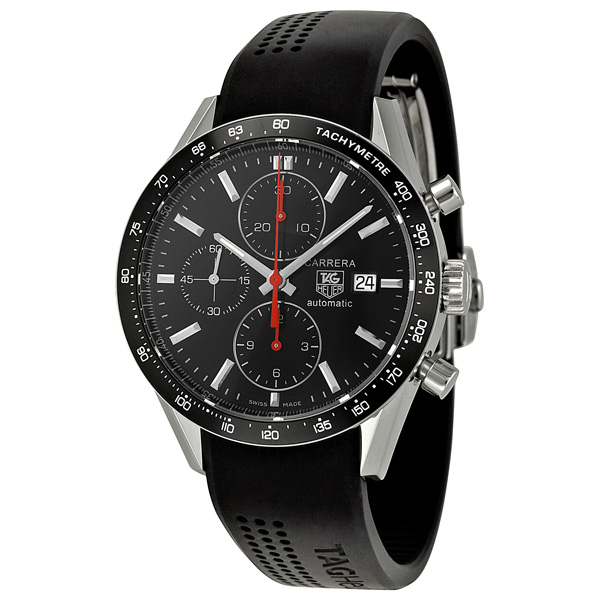 Stainless steel case with a black rubber strap. Fixed stainless steel bezel with a black ring showing tachymeter markings. Black dial with luminous hands and index hour markers. Minute markers around the outer rim. Dial Type: Analog. Luminescent hands and dial markers. Date display at the 3 o'clock position. Chronograph - three sub-dials displaying: 60 seconds, 30 minutes and 12 hours. TAG Heuer calibre 16 automatic movement, based upon Valjoux 7750, containing 25 Jewels, bitting at 28800 vph, and has a power reserve of approximately 42 hours. Scratch resistant sapphire crystal. Screw down crown. Solid case back. Round case shape. Case size: 41 mm. Case thickness: 16 mm. Band width: 20 mm. Band length: 9 inches. Deployment clasp. Water resistant at 30 meters / 100 feet. Functions: chronograph, date, hour, minute, second. Sport watch style. Watch label: Swiss made. Item Variations: Tag Heuer Carrera CV2014.FT6014, CV2014FT6014, CV2014. Tag Heuer Carrera Chronograph Black Dial Mens Watch CV2014.FT6014.