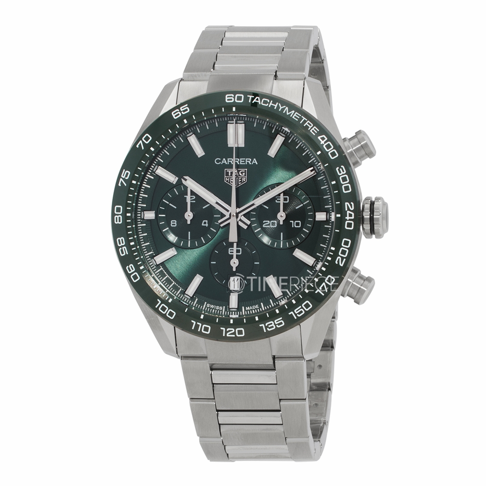 Silver-tone stainless steel case and bracelet. Fixed tachymeter scale green bezel. Green dial with silver-tone hands and index hour markers. Minute markers around the outer rim. Dial Type: Analog. Luminescent hands and markers. Date display at the 6 o'clock position. Chronograph - three sub-dials displaying: 60 second, 30 minute and 12 hour. Tag Heuer Calibre 02 Automatic movement, containing 33 Jewels, composed of 168 parts, bitting at 28800 vph, and has a power reserve of approximately 80 hours. Scratch resistant sapphire crystal. Transparent see through case back. Round case shape, case size: 44 mm. Deployment with push button release clasp. Water resistant at 100 meters / 330 feet. Functions: chronograph, column wheel, date, hour, minute, small second. Additional Info: original box, international warranty card, manual (complete accessories). Carrera Series. Luxury watch style. Watch label: Swiss Made. Tag Heuer Carrera Chronograph Automatic Green Dial Unisex Watch CBN2A1N-BA0643.