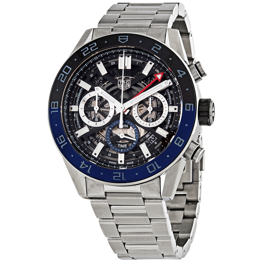Stainless steel case with a stainless steel bracelet. Fixed black and blue (Batman) ceramic bezel. Skeleton dial with lumiunous rhodium-plated hands and index hour markers. Minute markers around the outer rim. Dial Type: Analog. Luminescent hands and markers. Date display between the 4 and 5 o'clock positions. Chronograph - three sub-dials displaying: 60 second, 30 minute and 12 hours. Tag Heuer calibre 02 automatic movement with an 80-hour power reserve. Scratch resistant sapphire crystal. Pull / push crown. Transparent case back. Round case shape. Case size: 45 mm. Band width: 22 mm. Fold over clasp with a push button release. Water resistant at 100 meters / 330 feet. Functions: chronograph, date, hour, minute, second. Sport watch style. Watch label: Swiss Made. Tag Heuer Carrera Chronograph Automatic Batman Bezel Mens Watch CBG2A1Z.BA0658.