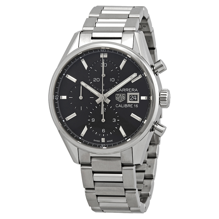 Stainless steel case with a stainless steel bracelet. Fixed stainless steel bezel. Black dial with luminous rhodium-plated hands and index hour markers. Minute markers around the outer rim. Dial Type: Analog. Luminescent hands and markers. Date display at the 3 o'clock position. Chronograph - three sub-dials displaying: 60 second, 30 minute and 12 hours. TAG Heuer calibre 16 automatic movement, based upon Valjoux 7750, containing 25 Jewels, bitting at 28800 vph, and has a power reserve of approximately 42 hours. Scratch resistant sapphire crystal. Pull / push crown. Transparent case back. Round case shape. Case size: 41 mm. Band width: 20 mm. Fold over clasp with a push button release. Water resistant at 100 meters / 330 feet. Functions: chronograph, date, hour, minute, second. Carrera Series. Luxury watch style. Watch label: Swiss Made. Tag Heuer Carrera Chronograph Automatic Black Dial Mens Watch CBK2110.BA0715.