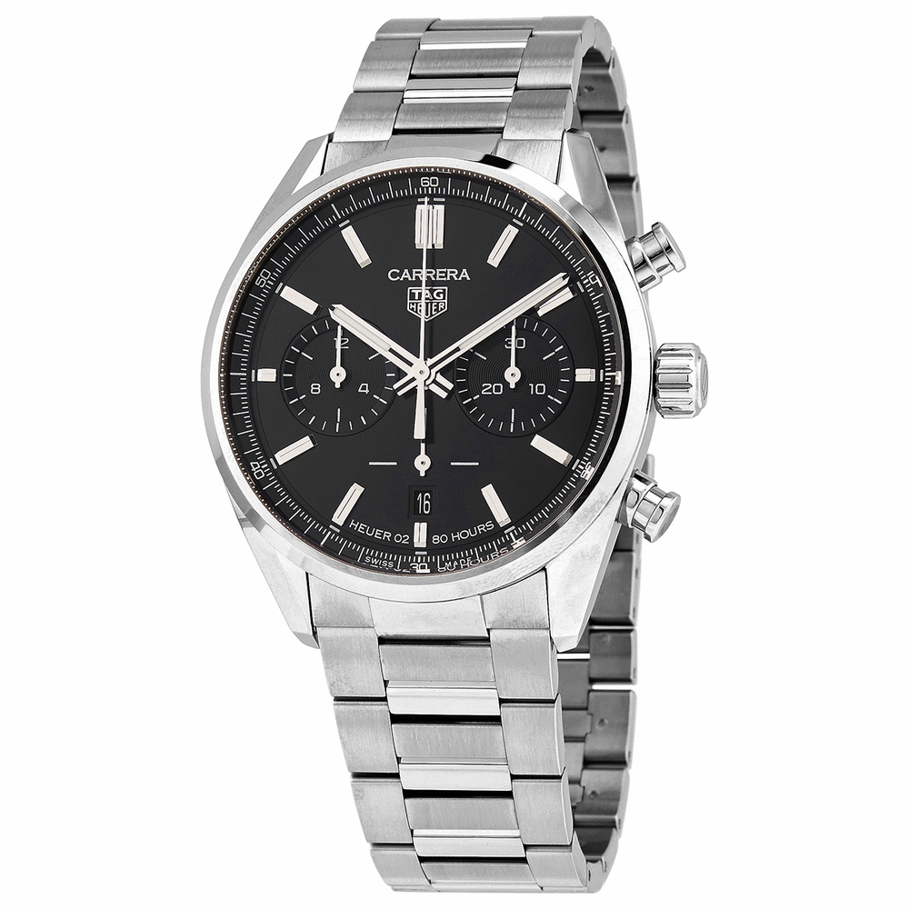 Stainless steel case with a stainless steel bracelet. Fixed stainless steel bezel. Black dial with luminous silver-tone hands and index hour markers. Arabic numeral minute markers (at 10 minute intervals). Minute markers around the outer rim. Dial Type: Analog. Luminescent hands and markers. Date display at the 6 o'clock position. Chronograph - three sub-dials displaying: 60 second, 30 minute and12 hours. Tag Heuer calibre HEUER 02 automatic movement. Scratch resistant sapphire crystal. Pull / push crown. Transparent case back. Round case shape. Case size: 42 mm. Band width: 22 mm. Deployment clasp with a push button release. Water resistant at 100 meters / 330 feet. Functions: chronograph, date, hour, minute, second. Luxury watch style. Watch label: Swiss Made. Tag Heuer Chronograph Automatic Black Dial Mens Watch CBN2010.BA0642.
