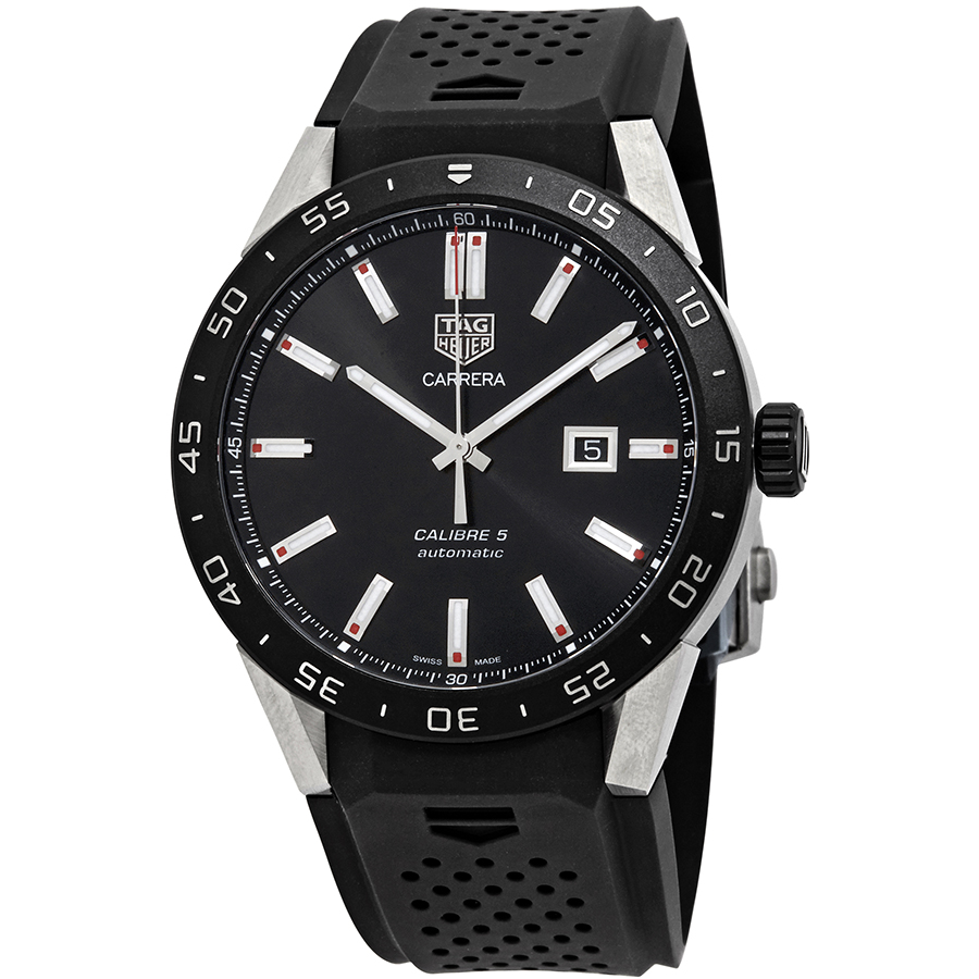 Titanium case with a black perforated rubber strap. Black dial with silver-tone hands and index hour markers. Minute markers around the outer rim. Dial Type: Analog. Luminescent hands and markers. Date display at the 3 o'clock position. Tag Heuer Calibre 5 automatic movement. Scratch resistant sapphire crystal. Solid case back. Round case shape. Case size: 46 mm. Folding clasp. Water resistant at 100 meters / 330 feet. Functions: date, hour, minute, second. Watch label: Swiss Made. Tag Heuer Connected Automatic Black Dial Watch SAR2A80.FT6049.