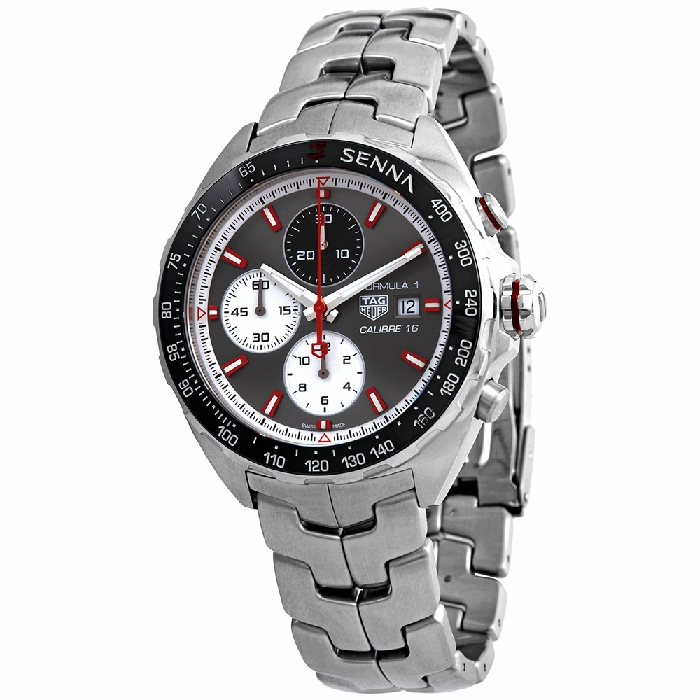 Silver-tone stainless steel case and bracelet. Black bezel. Anthracite grey dial with silver-tone hands and index hour markers. Tachymeter. Dial Type: Analog. Luminescent hands and markers. Date display at the 3 o'clock position. Chronograph - three sub-dials displaying: 60 second, 30 minute and 12 hours. Tag Heuer Calibre 16 Automatic movement, based upon Valjoux 7750, containing 25 Jewels, bitting at 28800 vph, and has a power reserve of approximately 42 hours. Scratch resistant sapphire crystal. Solid case back. Round case shape, case size: 44 mm. Deployment clasp. Water resistant at 200 meters / 660 feet. Functions: chronograph, date, hour, minute, second. Additional Info: senna special edition. Formula 1 Senna Special Edition Series. Watch label: Swiss Made. Tag Heuer Formula 1 Senna Special Edition Chronograph Automatic Mens Watch CAZ2017.BA0647.