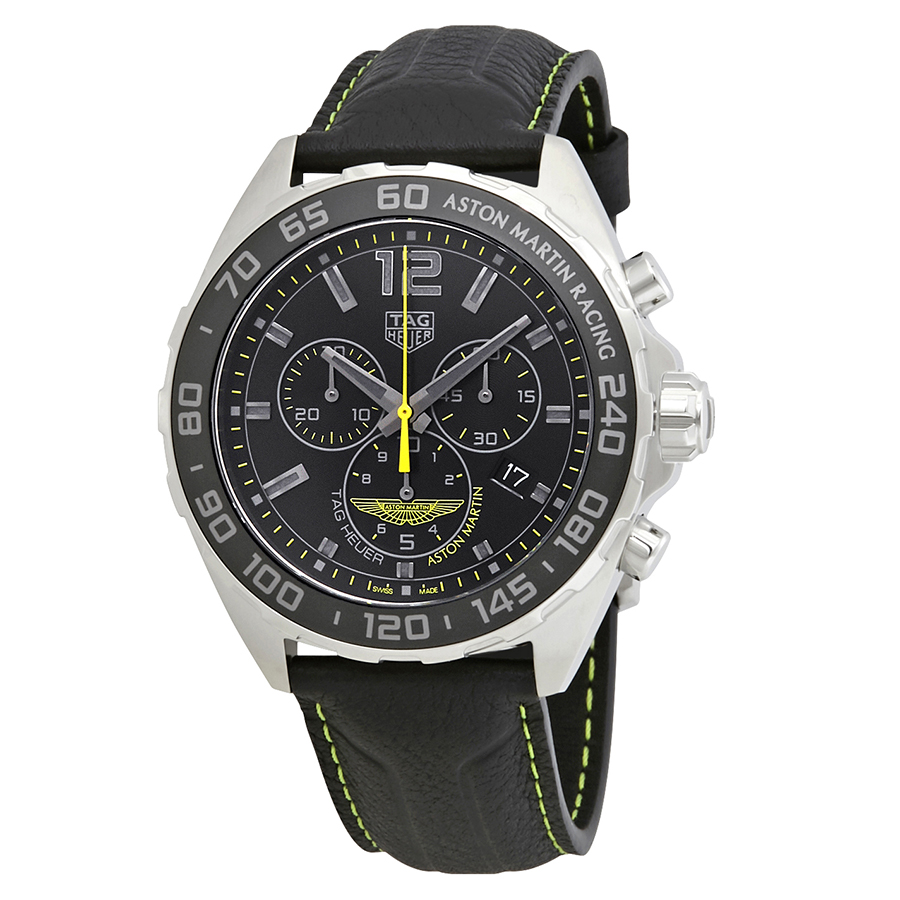 Stainless steel case with a black (calfskin) leather strap. Fixed stainless steel bezel with black aluminum ring showing tachymeter markings (Aston Martin racing). Black dial with luminous black hands and index hour markers. An Arabic numeral appears at the 12 o'clock position. Minute markers around the outer rim. Dial Type: Analog. Luminescent hands and markers. Date display at the 4 o'clock position. Chronograph - three sub-dials displaying: 60 second, 30 minute and 1/10th of a second. Quartz movement. Scratch resistant sapphire crystal. Screw down crown. Solid case back. Round case shape. Case size: 43 mm. Case thickness: 11.5 mm. Tang clasp. Water resistant at 200 meters / 660 feet. Functions: chronograph, tachymeter, date, hour, minute, second. Additional Info: limited edition. Sport watch style. Watch label: Swiss Made. Tag Heuer Formula 1 Chronograph Mens Limited Edition Watch CAZ101P.FC8245.