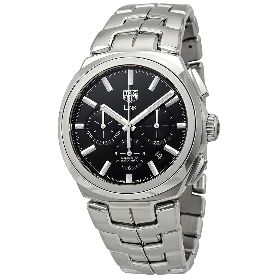 Stainless steel case with a stainless steel bracelet. Fixed stainless steel bezel. Black dial with luminous silver-tone hands and index hour markers. Minute markers around the outer rim. Dial Type: Analog. Luminescent hands and markers. Date display between the 4 and 5 o'clock positions. Chronograph - three sub-dials displaying: 60 second, 60 minute and 12 hours. Tag Heuer calibre 17 automatic movement with a about 42-hour power reserve. Scratch resistant sapphire crystal. Screw down crown. Transparent case back. Round case shape. Case size: 41 mm. Band width: 22 mm. Fold over clasp. Water resistant at 100 meters / 330 feet. Functions: chronograph, date, hour, minute, second. Luxury watch style. Watch label: Swiss Made. Tag Heuer Link Chronograph Automatic Black Dial Mens Watch CBC2110.BA0603.