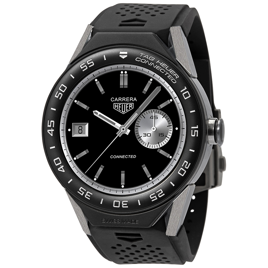 Black fine-brushed and polished titanium case with a black rubber strap. Fixed tachymeter scale black polished ceramic bezel. Digital dial. Tachymeter. Dial Type: digital. Tag Heuer Calibre 16 Automatic movement, based upon Valjoux 7750, containing 25 Jewels, bitting at 28800 vph, and has a power reserve of approximately 42 hours. Scratch resistant sapphire crystal. Transparent case back. Round case shape, case size: 45 mm, case thickness: 13.75 mm. Folding clasp. Water resistant at 50 meters / 165 feet. Functions: chronograph, date, hour, minute, second. Additional Info: screen resolution: 400 x 400. 512 mb main memory with 4 gb storage memory. bluetooth ble 4.1 - wifi 2.4 ghz 802.11 b/g/n. amoled multi-touch display. Connected Series. Sport watch style. Watch label: Swiss Made. Tag Heuer Connected Chronograph Smartwatch Digital Mens Smart Watch SBF8A8001.11EB0128.