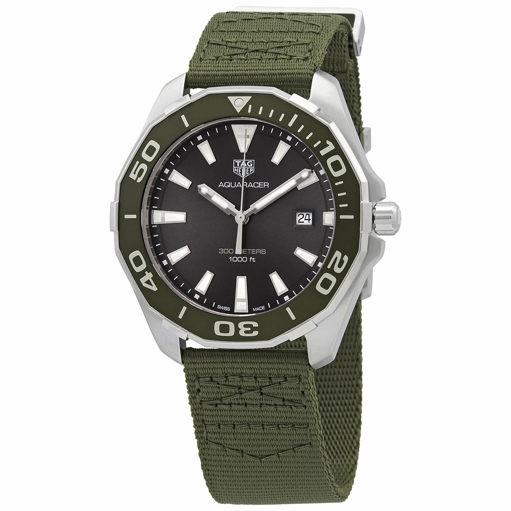 Fine-brushed/polished stainless steel case with a khaki nylon strap. Green sand-blasted aluminium bezel. Stingray grey dial with rhodium plated hands and index hour markers. Minute markers around the outer rim. Dial Type: Analog. Luminescent hands and markers. Date display at the 3 o'clock position. Quartz movement. Scratch resistant sapphire crystal. Screw down crown. Round case shape, case size: 43 mm. Buckle clasp. Water resistant at 300 meters / 1000 feet. Functions: date, hour, minute, second. Aquaracer Series. Watch label: Swiss Made. Tag Heuer Aquaracer Stingray Grey Dial Quartz Mens Watch WAY101L.FC8222.