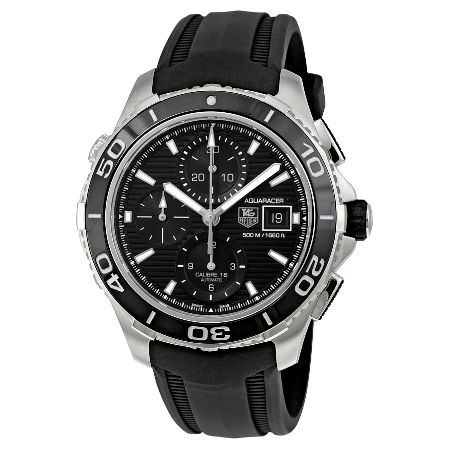 Stainless steel case with a black rubber strap. Uni-directional rotating stainless steel bezel with a black ceramic top ring. Black dial with luminous hands and index hour markers. Minute markers around the outer rim. Dial Type: Analog. Luminescent hands and markers. Date display at the 3 o'clock position. Chronograph - three sub-dials displaying: 60 second, 30 minute and 12 hour. Automatic movement with a 42 hour power reserve. Scratch resistant sapphire crystal. Screw down crown. Screw down case back. Case diameter: 43 mm. Case thickness: 16 mm. Round case shape. Tang clasp. Water resistant at 500 meters / 1650 feet. Functions: chronograph, date, hour, minute, second. Dress watch style. Watch label: Swiss Made. Tag Heuer Aquaracer Black Dial Chronograph Black Rubber Mens Watch CAK2110FT8019.