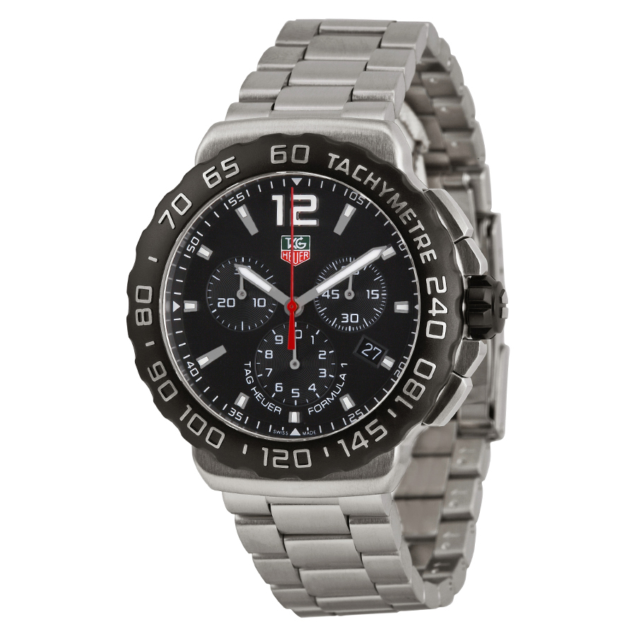 Stainless steel case with a stainless steel bracelet. Black titanium carbide coated steel bezel showing tachymeter markings. Black dial with silver-tone hands and stick hour markers. Arabic numeral marks the 12 o'clock position. Minute markers around the outer rim. Dial Type: Analog. Luminescent hands and markers. Date display appears at the 4 o'clock position. Chronograph - three sub-dials displaying: 60 second, 30 minute and 1/10th of a second. Swiss quartz movement. Scratch resistant sapphire crystal. Solid case back. Case diameter: 42 mm. Case thickness: 11 mm. Round case shape. Band width: 20 mm. Fold over clasp with safety release. Water resistant at 200 meters / 660 feet. Functions: chronograph, date, hour, minute, second. Sport watch style. Watch label: Swiss Made. Tag Heuer Formula 1 Chronograph Black Dial Stainless Steel Mens Watch CAU1110.BA0858.