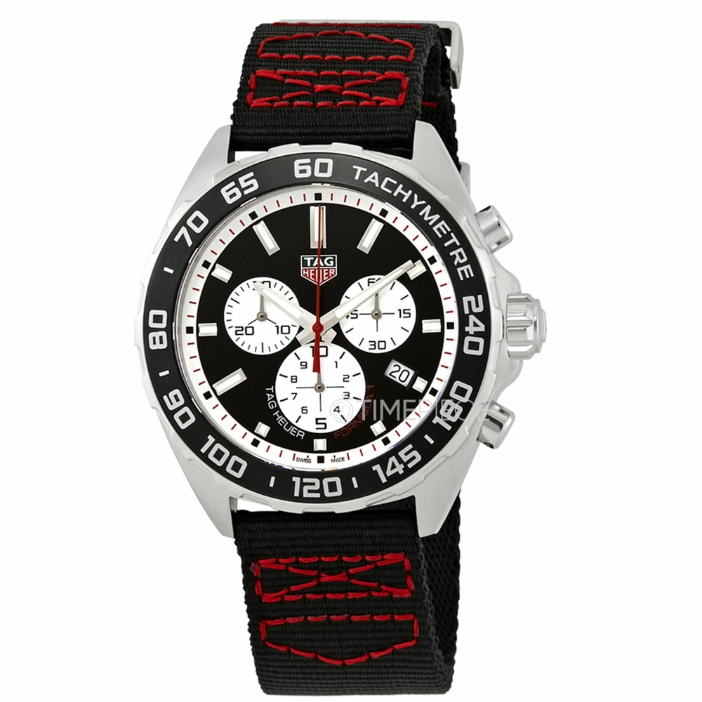 Stainless steel case with a black textile strap with red contrast stiching. Fixed stainless steel bezel with a black aluminium top ring. Black dial with luminous silver-tone hands and index hour markers. Tachymeter scale around the outer rim. Dial Type: Analog. Luminescent hands. Date display at the 4 o'clock position. Chronograph - three white sub-dials displaying: 60 second, 30 minute and 1/10th of a second. Quartz movement. Scratch resistant sapphire crystal. Screw down crown. Solid case back. Round case shape. Case size: 43 mm. Band width: 21 mm. Tang clasp. Water resistant at 200 meters / 660 feet. Functions: chronograph, tachymeter, date, hour, minute, second. Luxury watch style. Watch label: Swiss Made. Tag Heuer Formula One Chronograph Black Dial Mens Watch CAZ101E.FC8228.