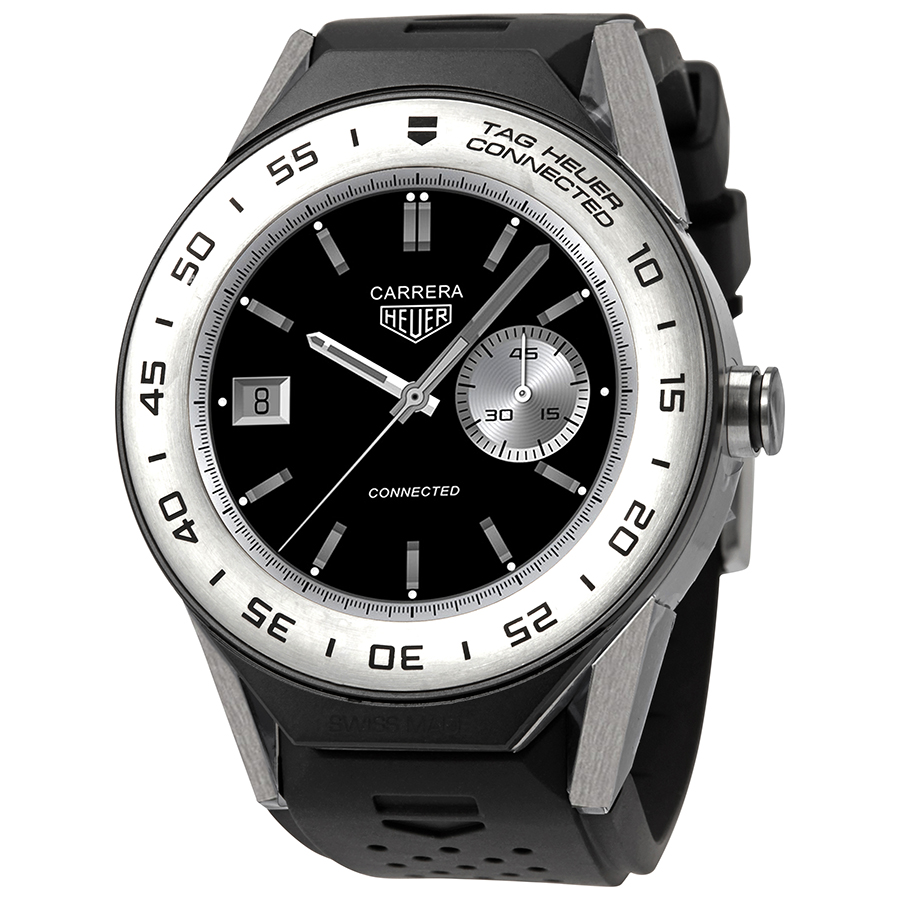 Fine-brushed and polished titanium case with a black rubber strap. Fine-brushed steel bezel. Digital dial. Dial Type: Analog-digital. Quartz movement. Scratch resistant sapphire crystal. Round case shape. Case size: 41 mm. Water resistant at 50 meters / 165 feet. Functions: chronograph, date, hour, minute, second, alarm,timer, gps, accelerometer, gyroscope with tilt detection, ambient light sensor, microphone. Additional Info: 1gb main memory with 8gb storage memory. bluetooth ble 4.1 - wlan 2.4 ghz 802.11 b/g/n connectivity. compatible with android 4.4+ / ios 9+. Watch label: Swiss Made. Tag Heuer Connected Modular Alarm Chronograph Quartz Analog-Digital Watch SBF818001.11FT8031.