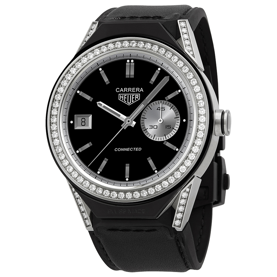 Fine brushed and polished titanium case with a calf skin and rubber strap. Fixed- set with 62 diamonds sandblasted steel bezel. Digital dial. Dial Type: Analog-digital. Quartz movement. Scratch resistant sapphire crystal. Round case shape, case size: 45 mm, case thickness: 13.75 mm. Folding clasp. Functions: chronograph, date, hour, minute, second, alarm,timer, gps, accelerometer, gyroscope with tilt detection,ambient light senso, microphone, vibrations / haptics engine feature. Additional Info: screen resolution: 400 x 400. 512 mb main memory with 4gb storage. bluetooth and wi-fi connectivity, compatible with android 4.4+ / ios 9.3+. Watch label: Swiss Made. Tag Heuer Connected Modular Alarm Chronograph Quartz Analog-Digital Mens Watch SBF8A8011.62FT6079.