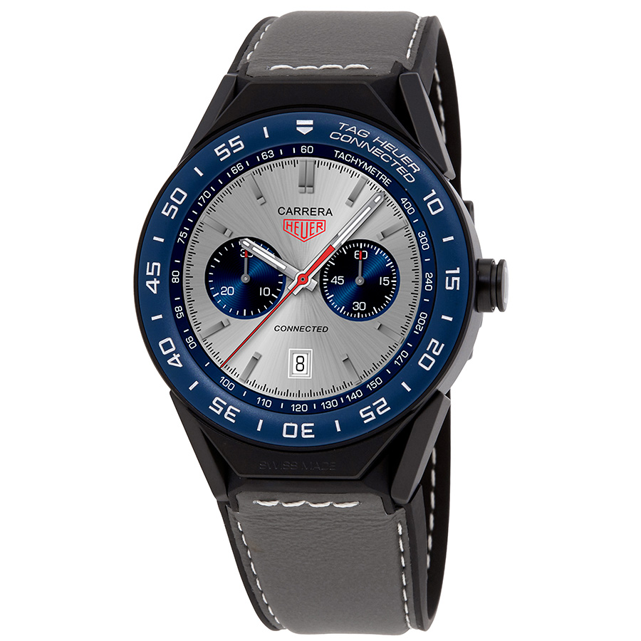 Black PVD coated brushed and polished titanium case with a calf leather and rubber strap. Blue sandblasted ceramic bezel. Digital dial. Dial Type: digital. Quartz movement. Scratch resistant sapphire crystal. Transparent case back. Round case shape, case size: 45 mm, case thickness: 13.75 mm. Folding clasp. Water resistant at 50 meters / 165 feet. Functions: chronograph, date, hour, minute, second, alarm, timer, gps, accelerometer, gyroscope with tilt detection, ambient light sensor, microphone. Additional Info: screen resolution: 400 x 400, touch on display supporting multiple finger recognition, powered by intel, memory: 512 mb; 4 gb storage. Tag Heuer Connected Modular Mens Digital Watch SBF8A8021.82FT6104.
