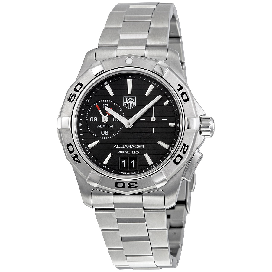 Silver-tone stainless steel case with a silver-tone stainless steel bracelet. Uni-directional rotating silver-tone stainless steel bezel. Black dial with luminous hands and index hour markers. Minute markers around the oute rrim. Dial Type: Analog. Luminescent hands and markers. Date display at the 6 o'clock position. Two: 12 hours and 60 seconds subdials. Quartz movement. Scratch resistant sapphire crystal. Screw down crown. Solid case back. Round case shape, case size: 39 mm, case thickness: 10 mm. Band width: 22 mm. Deployment clasp. Water resistant at 300 meters / 1000 feet. Functions: alarm, hours, minutes, seconds, date. Dive watch style. Watch label: Swiss Made. Item Variations: WAP111Z-BA0831, WAP111ZBA0831, WAP111Z/BA0831, WAP111Z BA0831. Tag Heuer Aquaracer Black Dial Mens Watch WAP111Z.BA0831.
