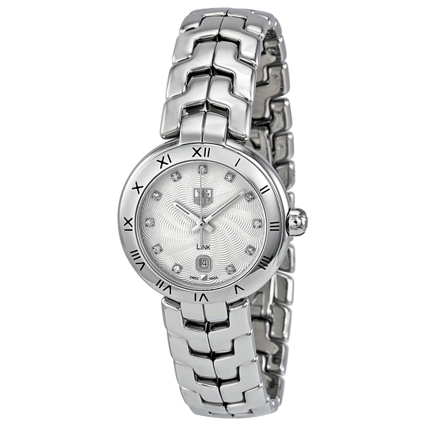 Stainless steel case with a stainless steel bracelet. Fixed stainless steel bezel. Mother of pearl guilloche dial with silver-tone hands and diamond hour markers. Roman numeral markings on the bezel. Dial Type: Analog. Luminescent hands. Date display appears at the 6 o'clock position. Quartz movement. Scratch resistant sapphire crystal. Pull / push crown. Solid case back. Case diameter: 29 mm. Round case shape. Deployment with push button clasp. Water resistant at 100 meters / 330 feet. Functions: date, hour, minute, second. Dress watch style. Watch label: Swiss Made. Tag Heuer Link Diamond Mother of Pearl Steel Ladies Watch WAT1411.BA0954.