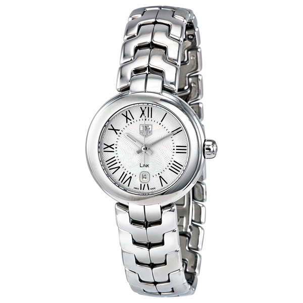 Polished stainless steel case with a stainless steel bracelet. Polished stainless steel fixed bezel. Silver dial s-shape guilloche dial with silver-tone hands and Roman numeral hour markers. Minute markers around an inner ring. Dial Type: Analog. Luminescent hands. Date display appears at the 6 o'clock position. Quartz movement. Scratch resistant sapphire crystal. Solid case back. Case diameter: 29 mm. Round case shape. Deployment clasp with push button. Water resistant at 100 meters / 330 feet. Functions: date, hour, minute, second. Dress watch style. Watch label: Swiss Made. Tag Heuer Link Silver Guilloche Dial Stainless Steel Ladies Watch WAT1416.BA0954.