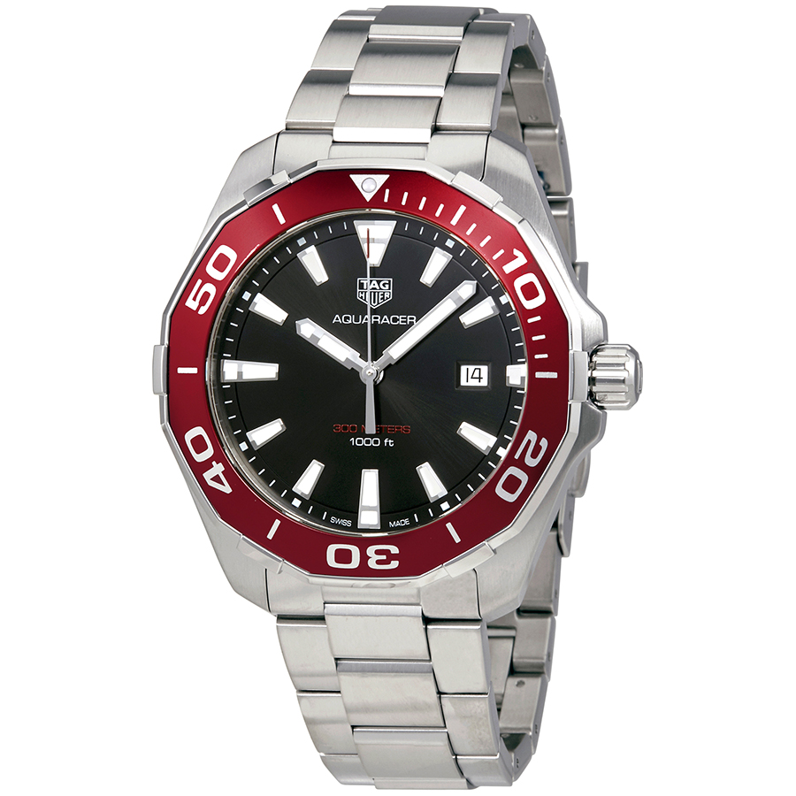 Stainless steel case with a stainless steel bracelet. Uni-directional rotating silver-tone bezel with a red aluminum top ring. Black dial with luminous silver-tone hands and index hour markers. Minute markers around the outer rim. Dial Type: Analog. Luminescent hands and markers. Date display at the 3 o'clock position. Quartz movement. Scratch resistant sapphire crystal. Screw down crown. Solid case back. Case size: 43 mm. Case thickness: 11.5 mm. Round case shape. Band width: 20 mm. Deployment clasp with a piush button release. Water resistant at 300 meters / 1000 feet. Functions: date, hour, minute, second. Luxury watch style. Watch label: Swiss Made. Tag Heuer Aquaracer Black Dial Stainless Steel Mens Watch WAY101B.BA0746.