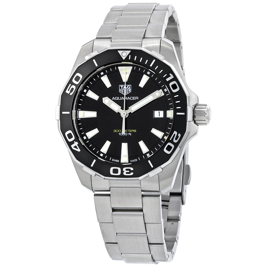 Stainless steel case with a stainless steel bracelet. Uni-directional rotating stainless steel bezel with a black aluminum top ring. Black dial with luminous silver-tone hands and index hour markers. Minute markers around the outer rim. Dial Type: Analog. Luminescent hands and markers. Date display at the 3 o'clock position. Quartz movement. Scratch resistant sapphire crystal. Screw down crown. Solid screw-in case back with a diving bell engraving. Case size: 41 mm. Case thickness: 14 mm. Round case shape. Deployment clasp. Water resistant at 300 meters / 1000 feet. Functions: date, hour, minute, second. Sport watch style. Watch label: Swiss Made. Item Variations: WAY111ABA0928. Tag Heuer Aquaracer Black Dial Quartz Mens Watch WAY111A.BA0928.