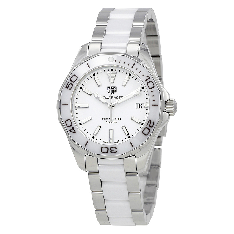 Stainless steel case with a stainless steel bracelet with white ceramic center links. Uni-directional rotating stainless steel bezel with a white ceramic top ring. White dial with luminous silver-tone hands and index hour markers. Minute markers around the outer rim. Dial Type: Analog. Luminescent hands and markers. Date display at the 3 o'clock position. Quartz movement. Scratch resistant sapphire crystal. Screw down crown. Solid case back. Case size: 35 mm. Case thickness: 12 mm. Round case shape. Bracelet width: 16 mm. Deployment clasp. Water resistant at 300 meters / 1000 feet. Functions: date, hour, minute, second. Luxury watch style. Watch label: Swiss Made. Tag Heuer Aquaracer White Dial Ladies Watch WAY131B.BA0914.