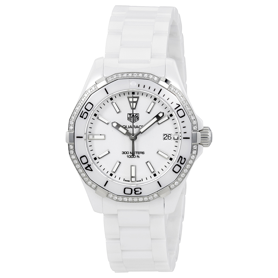 White ceramic case with a white ceramic bracelet. Fixed stainless steel bezel with a white ceramic top ring set with diamonds. White dial with luminous silver-tone hands and index hour markers. Minute markers around the outer rim. Dial Type: Analog. Luminescent hands and markers. Date display at the 3 o'clock position. Quartz movement. Scratch resistant sapphire crystal. Screw down crown. Solid case back. Case size: 35 mm. Case thickness: 10 mm. Round case shape. Bracelet width: 20 mm. Deployment clasp with a push button release. Water resistant at 300 meters / 1000 feet. Functions: date, hour, minute, second. Luxury watch style. Watch label: Swiss Made. Tag Heuer Aquaracer White Dial Ladies Watch WAY1396.BH0717
