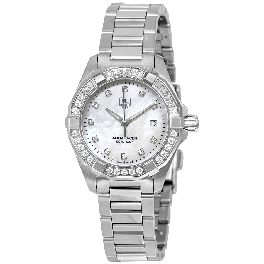 Stainless steel case with a stainless steel bracelet. Uni-directional rotating stainless steel bezel set with diamonds. Mother of pearl dial with luminous silver-tone hands and diamond hour markers. Minute markers around the outer rim. Dial Type: Analog. Luminescent hands. Date display at the 3 o'clock position. Quartz movement. Scratch resistant sapphire crystal. Screw down crown. Screw in case back. Case diameter: 27 mm. Case thickness: 9.5 mm. Round case shape. Band width: 16 mm. Deployment clasp. Water resistant at 300 meters / 1000 feet. Functions: date, hour, minute, second. Luxury watch style. Watch label: Swiss Made. Tag Heuer Aquaracer Mother of Pearl Diamond Dial Ladies Watch WAY1414.BA0920.