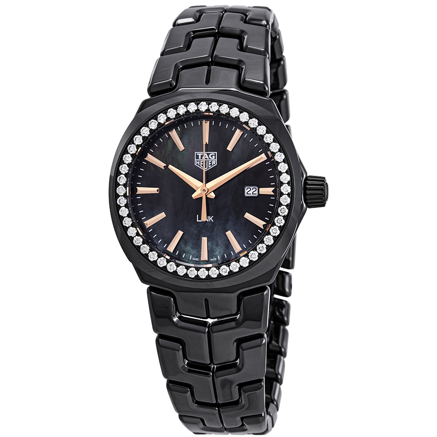 Black ceramic case with a black ceramic bracelet. Fixed black ceramic bezel set with diamonds. Black mother of pearl dial with rose gold-plated hands and Roman numeral hour markers. Minute markers around the outer rim. Dial Type: Analog. Date display at the 3 o'clock position. Quartz movement. Scratch resistant sapphire crystal. Pull / push crown. Solid case back. Round case shape. Case size: 32 mm. Fold over clasp with a push button release. Water resistant at 100 meters / 330 feet. Functions: date, hour, minute, second. Dress watch style. Watch label: Swiss Made. Tag Heuer Link Diamond Ladies Watch WBC1390.BH0744.