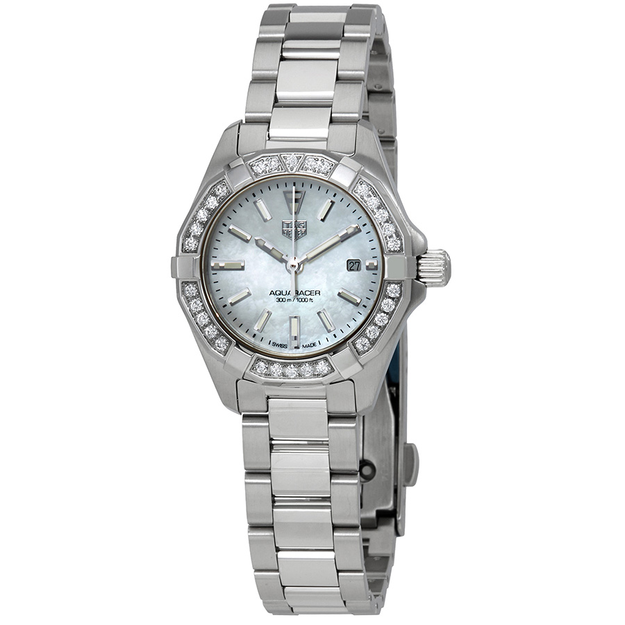 Stainless steel case with a stainless steel bracelet. Uni-directional rotating stainless steel bezel set with diamonds. White mother of pearl dial with luminous silver-tone hands and index hour markers. Minute markers around the outer rim. Dial Type: Analog. Luminescent hands and markers. Date display at the 3 o'clock position. Quartz movement. Scratch resistant sapphire crystal. Pull / push crown. Solid case back. Round case shape. Case size: 27 mm. Case thickness: 9 mm. Deployment clasp with a push button release. Water resistant at 300 meters / 1000 feet. Functions: date, hour, minute, second. Dress watch style. Watch label: Swiss Made. Tag Heuer Aquaracer Diamond White Mother of Pearl Dial Ladies Watch WBD1413.BA0741.