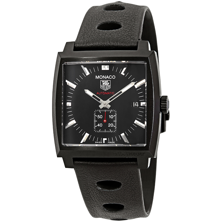 Black PVD stainless steel case with a black leather strap. Fixed black PVD bezel. Black dial with luminous silver-tone hands and index hour markers. Minute markers. Dial Type: Analog. Luminescent hands and markers. Date display at the 3 o'clock position. Seconds sub-dial at the 6 o'clock position. Automatic movement with a 42-hour power reserve. Scratch resistant sapphire crystal. Pull / push crown. Transparent case back. Cushion case shape. Case size: 37 mm. Case thickness: 14 mm. Band width: 22 mm. Deployment clasp. Water resistant at 50 meters / 165 feet. Functions: date, hour, minute, second. Casual watch style. Watch label: Swiss Made. Tag Heuer Monaco Automatic Black Dial Mens Watch WW2119.FC6375.