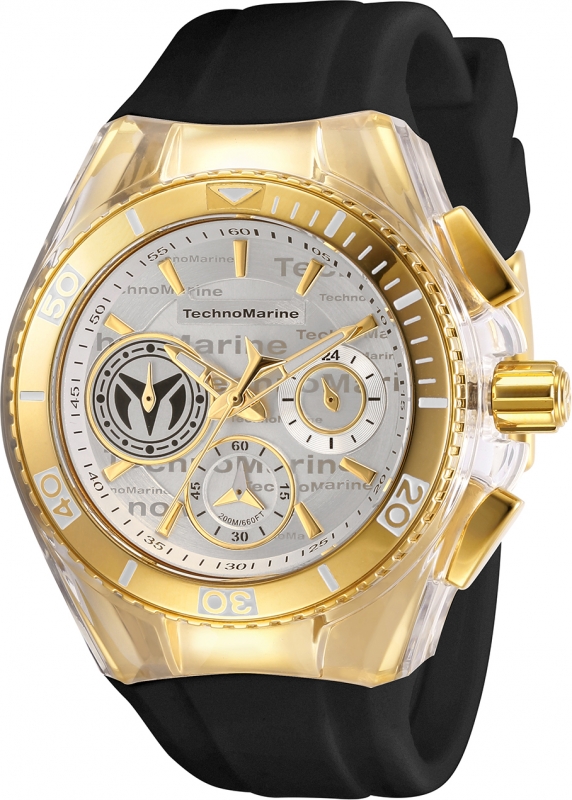 Stainless steel case with a black silicone strap. Bi-directional rotating gold-tone bezel. Antique gold and grey dial with luminous gold-tone hands and index hour markers. Arabic numeral minute markers (at 5 minute intervals). Minute markers around the outer rim. Dial Type: Analog. Luminescent hands. Chronograph - three sub-dials displaying: 60 second, 60 minute and 24 hour. Hattori caliber VD54 quartz movement. Scratch resistant mineral crystal. Screw down crown. Solid case back. Round case shape. Case size: 40.57 mm. Case thickness: 13.65 mm. Band width: 26.25 mm. Band length: 7.68 inches. Tang clasp. Water resistant at 200 meters / 660 feet. Functions: chronograph, GMT, second time zone, hour, minute, second. California Cruise Series. Sport watch style. Watch label: Japan Movt. Technomarine California Cruise Chronograph Quartz Ladies Watch TM-118136.