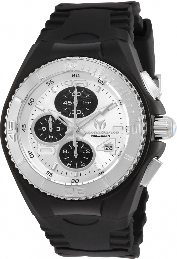 Stainless steel case with a black silicone strap. Uni-directional rotating stainless steel bezel. Silver-tone dial with silver-tone arrow-shaped hands and index hour markers. Arabic numeral minute markers (at 5 minute intervals). Minute markers around the outer rim. Dial Type: Analog. Luminescent hands and markers. Date display at the 4 o'clock position. Chronograph - three black sub-dials displaying: 60 minute, 12 hour and 1/20th of a second. Miyota caliber OS60 quartz movement. Scratch resistant Flame Fusion crystal. Screw down crown. Solid case back. Round case shape. Case size: 40 mm. Case thickness: 13 mm. Band width: 26 mm. Band length: 7 inches. Tang clasp. Water resistant at 200 meters / 660 feet. Functions: chronograph, date, hour, minute, second. Cruise Series. Sport watch style. Watch label: Japan Movt. Technomarine Chronograph Quartz Silver Dial Ladies Watch TM-115269.