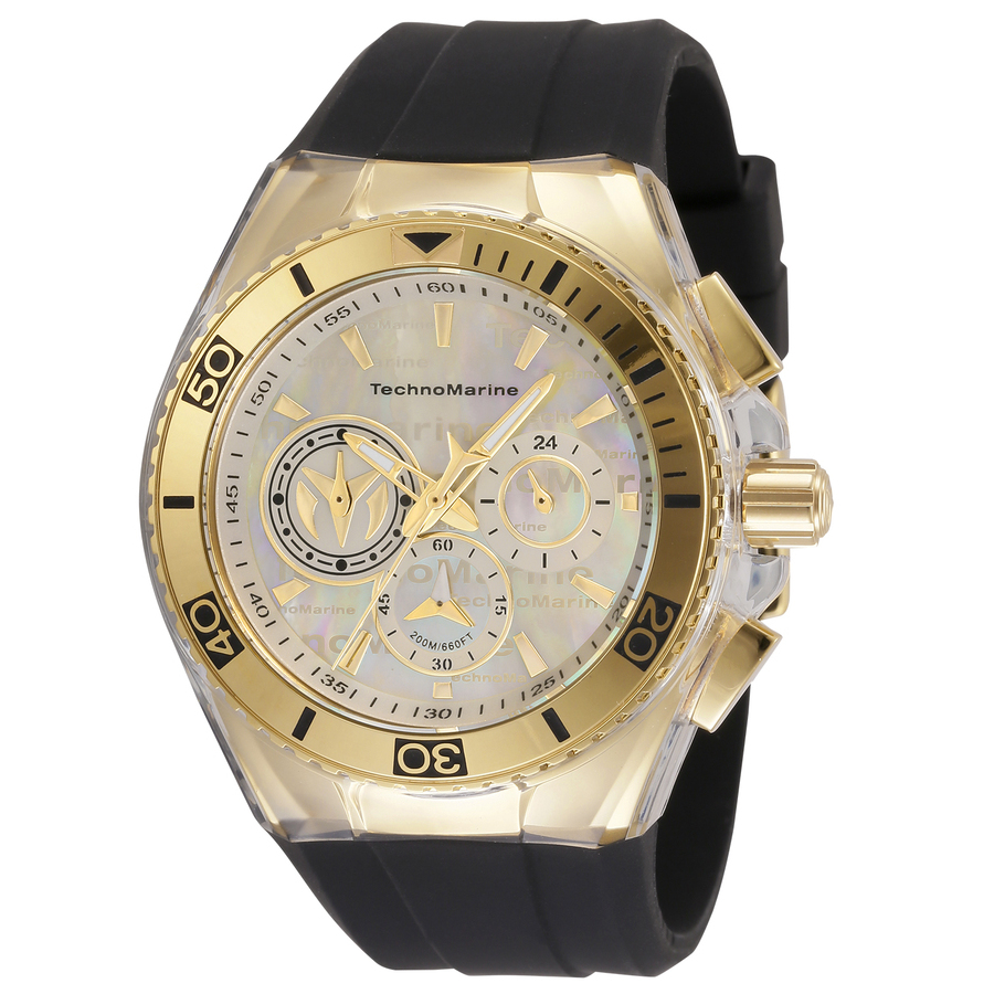 Gold-tone stainless steel case with a black silicone strap. Uni-directional rotating gold-tone bezel. Champagne mother of pearl dial with luminous gold-tone hands and index hour markers. Arabic numeral minute markers (at 5 minute intervals). Minute markers around the outer rim. Dial Type: Analog. Luminescent hands and markers. Chronograph - three sub-dials displaying: 60 second, 60 minute and 24 hour. Caliber VD54 quartz movement. Scratch resistant mineral crystal. Screw down crown. Solid case back. Round case shape. Case size: 46.65 mm. Band width: 29 mm. Band length: 210mm. Tang clasp. Water resistant at 200 meters / 660 feet. Functions: chronograph, hour, minute, second. Cruise California Series. Dress watch style. Watch label: Japan Movt. Technomarine Cruise California Chronograph Quartz Mens Watch TM-120026.