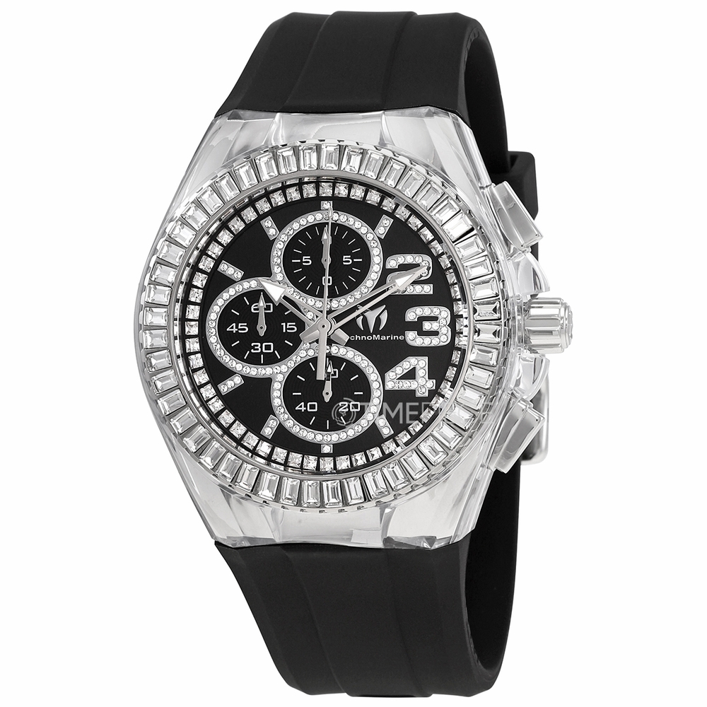 Stainless steel case with a black silicone strap. Fixed stainless steel bezel set with white baguette crystals. Black (crystal-set) dial with silver-tone skeleton hands and crystal index hour markers. Crystal-set Arabic numerals appear at the 2, 3 and 4 o'clock positions. Dial Type: Analog. Luminescent hands. Chronograph - three sub-dials displaying: 60 second, 60 minute and 1/10th of a second. Hattori caliber VD55 quartz movement. Scratch resistant Flame Fusion crystal. Pull / push crown. Solid case back. Round case shape. Case size: 45 mm. Case thickness: 14 mm. Band width: 29 mm. Band length: 8 inches. Tang clasp. Water resistant at 200 meters / 660 feet. Functions: chronograph, hour, minute, second. Cruise Series. Sport watch style. Watch label: Japan Movt. Technomarine Cruise Chronograph Quartz Black Dial Mens Watch TM-121006.