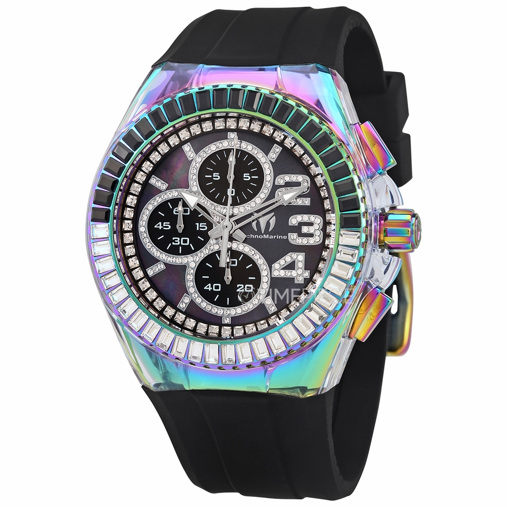 Iridescent-plated stainless steel case with a black silicone strap. Fixed iridescent-plated bezel set with black and white crystals. Black (crystal-set) dial with silver-tone skeleton hands and crystal-set index hour markers. Crystal-set Arabic numerals appear at the 2, 3, and 4 o'clock positions. Minute markers around the outer rim. Dial Type: Analog. Chronograph - three sub-dials displaying: 60 second, 60 minute and 1/10th of a second. Hattori Caliber VD55 quartz movement. Scratch resistant Flame Fusion crystal. Solid case back. Round case shape. Case size: 45 mm. Case thickness: 14 mm. Band width: 29 mm. Band length: 8 inches. Tang clasp. Water resistant at 200 meters / 660 feet. Functions: chronograph, hour, minute, second. Cruise Series. Sport watch style. Watch label: Japan Movt. Technomarine Cruise Chronograph Quartz Crystal Black Dial Mens Watch TM-121035.