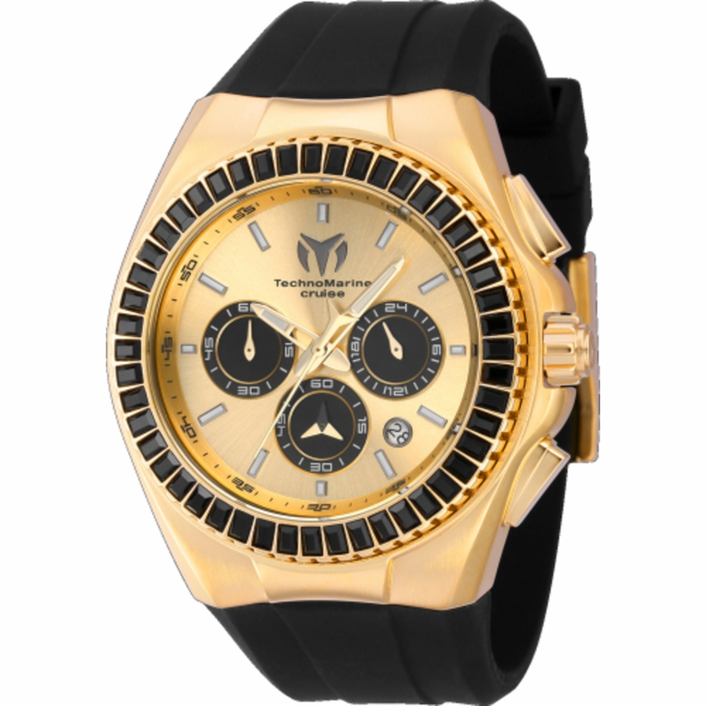 Gold-tone stainless steel case with a black silicone strap. Fixed gold-tone bezel set with black crystals. Gold dial with luminous gold-tone hands and index hour markers. Arabic numeral minute markers (at 5 minute intervals). Dial Type: Analog. Luminescent hands and markers. Date display between the 4 and 5 o'clock positions. Chronograph - three sub-dials displaying: 24 hours, 60 minutes, 60 seconds. Hattori caliber VD53 quartz movement. Scratch resistant mineral crystal. Screw down crown. Solid case back. Round case shape. Case size: 45 mm. Case thickness: 14.15 mm. Band width: 29 mm. Bband length: 8.25 inches. Tang clasp. Water resistant at 200 meters / 660 feet. Functions: chronograph, date, GMT, second time zone, hour, minute, second. Cruise Series. Sport watch style. Watch label: Japan Movt. Technomarine Cruise Chronograph Quartz Crystal Gold Dial Mens Watch TM-121144.