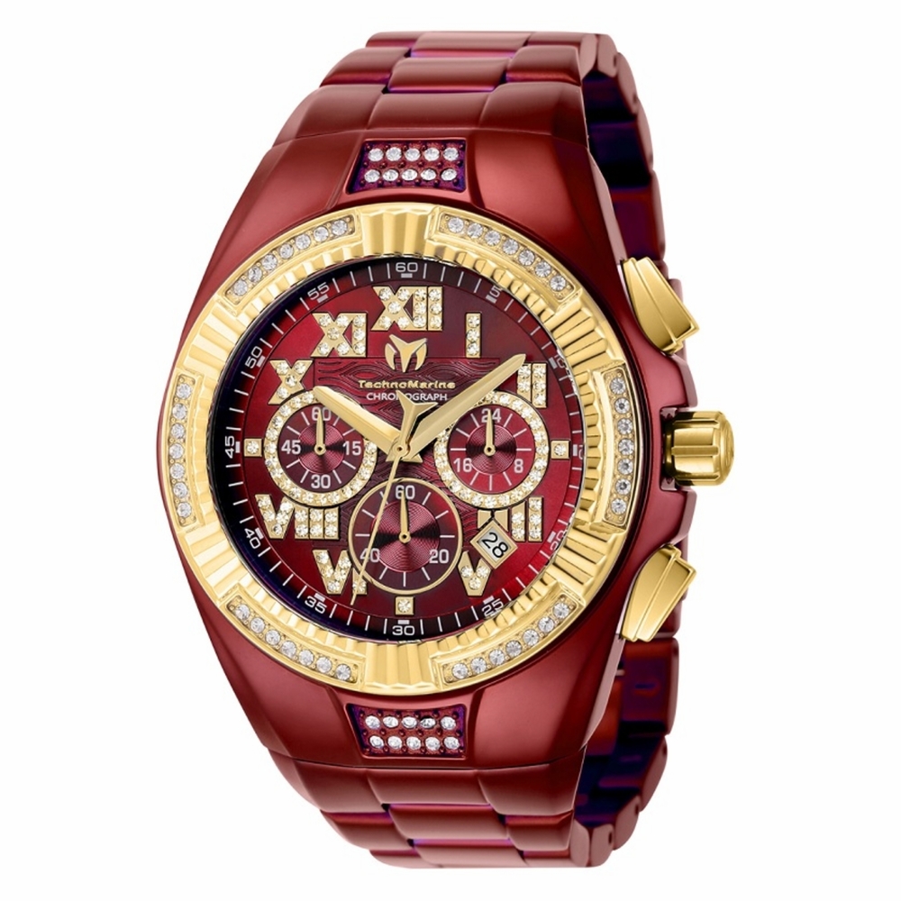 Red stainless steel case and bracelet. Fixed gold-tone stainless steel bezel set with crystals. Red dial with gold-tone hands and Roman numeral hour markers. Arabic numeral minute markers (at 5 minute intervals). Dial Type: Analog. Date display between 4 and 5 o'clock position. Chronograph - three sub-dials displaying: 60 second, 60 minute and 24 hour. TMI Caliber VD53B-14 quartz movement. Scratch resistant Flame Fusion crystal. Pull / push crown. Solid case back. Round case shape, case size: 44.5 mm. Band width: 29 mm. Foldover clasp. Water resistant at 100 meters / 330 feet. Functions: chronograph, date, hour, minute, second. Cruise Series. Sport watch style. Watch label: Japan Movt. Technomarine Cruise Chronograph Quartz Crystal Red Dial Mens Watch TM-121236.