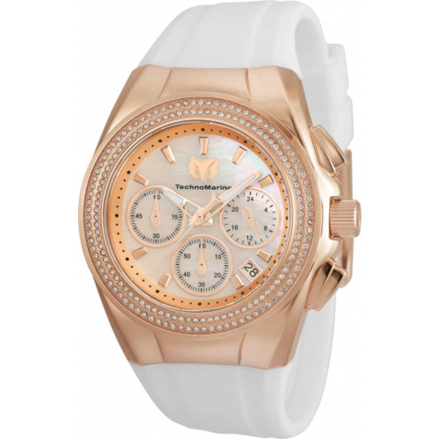 Rose gold-tone stainless steel case with a white silicone strap. Fixed rose gold-tone bezel with crystal set. Mother of pearl dial with rose gold-tone hands and index hour markers. Minute markers around the outer rim. Dial Type: Analog. Luminescent hands and markers. Date display between 4 and 5 o'clock position. Chronograph - three sub-dials displaying: 60 second, 60 minute and 24 hour. Hattori Caliber VD53 quartz movement. Scratch resistant Flame Fusion crystal. Screw down crown. Solid case back. Round case shape, case size: 40 mm, case thickness: 13.5 mm. Band width: 25 mm, band length: 7.50 inches. Buckle clasp. Water resistant at 200 meters / 660 feet. Functions: chronograph, date, GMT, second time zone, hour, minute, second. Cruise Diva Pave Series. Sport watch style. Watch label: Japan Movt. Technomarine Cruise Diva Pave Chronograph Crystal Watch TM-120042.