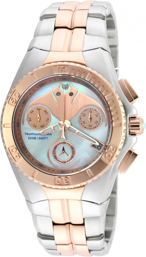 Stainless steel case with a two-tone (silver-tone and rose gold-tone) stainless steel bracelet. Uni-directional rotating rose gold-tone bezel. Mother of pearl dial with rose gold-tone skeleton hands. Arabic numeral minute markers (at 5 minute intervals). Minute markers around the outer rim. Dial Type: Analog. Date display at the 4 o'clock position. Chronograph - two sub-dials displaying: 60 second and 30 minute. Day of the week sub-dial. Ronda caliber Z60 quartz movement. Scratch resistant Flame Fusion crystal. Screw down crown. Solid case back. Round case shape. Case size: 40 mm. Case thickness: 13 mm. Band width: 25 mm. Band length: 8 inches. Deployment clasp with a push button release. Water resistant at 200 meters / 660 feet. Functions: chronograph, date, day, hour, minute, small second. Cruise Dream Series. Sport watch style. Watch label: Swiss Movt. TechnoMarine Cruise Dream Chronograph Quartz Mens Watch TM-115098.