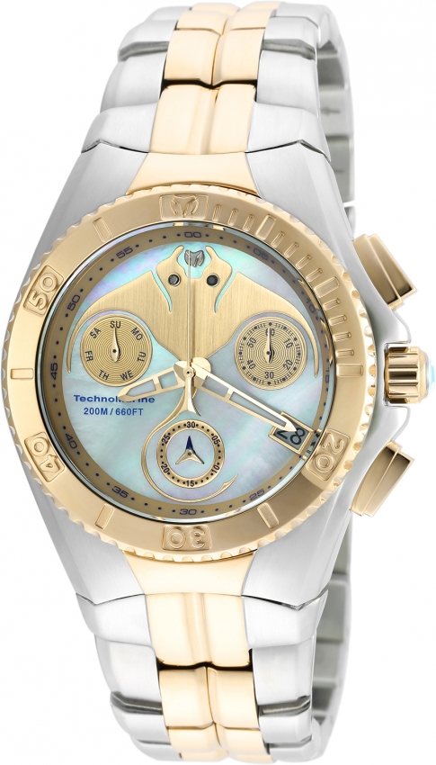 Stainless steel case with a two-tone (silver-tone and yellow gold-tone) stainless steel bracelet. Uni-directional rotating yellow gold-tone bezel. Mother of pearl dial with yellow gold-tone skeleton hands. Arabic numeral minute markers (at 5 minute intervals). Minute markers around the outer rim. Dial Type: Analog. Date display at the 4 o'clock position. Chronograph - two sub-dials displaying: 60 second and 30 minute. Day of the week sub-dial. Ronda caliber Z60 quartz movement. Scratch resistant Flame Fusion crystal. Screw down crown. Solid case back. Round case shape. Case size: 40 mm. Case thickness: 13 mm. Band width: 25 mm. Band length: 8 inches. Deployment clasp with a push button release. Water resistant at 200 meters / 660 feet. Functions: chronograph, date, day, hour, minute, small second. Cruise Dream Series. Sport watch style. Watch label: Swiss Movt. TechnoMarine Cruise Dream Chronograph Quartz Mother of Pearl Dial Mens Watch TM-115097.