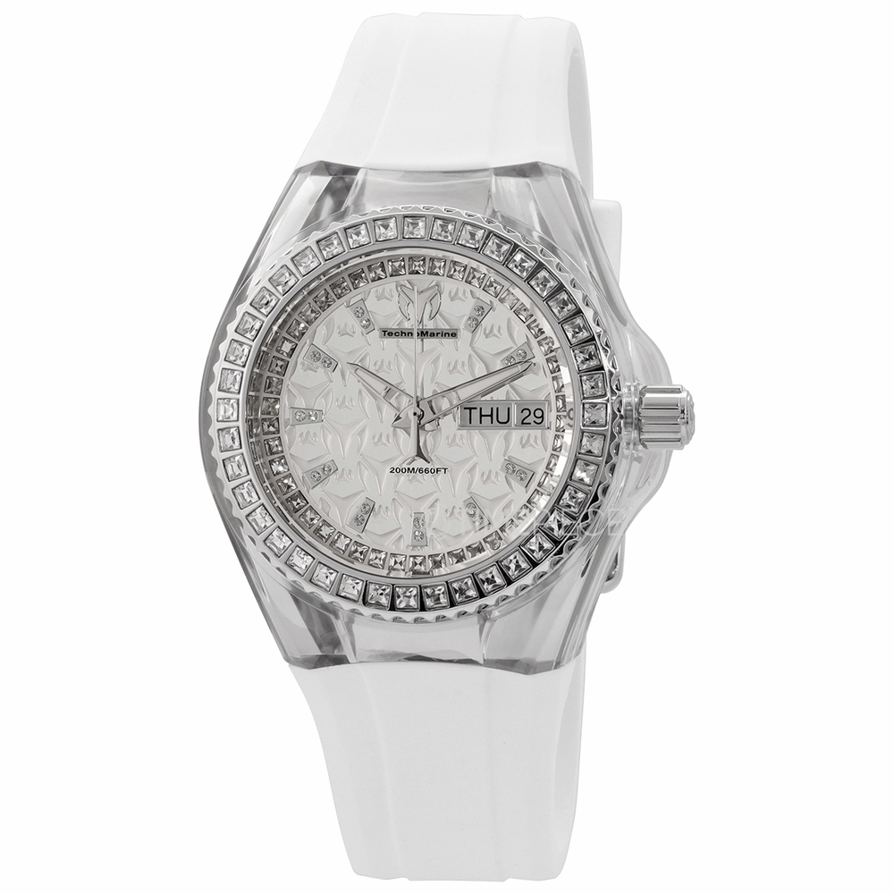 Silver-tone stainless steel case with a white silicone strap. Fixed silver-tone bezel with crystal set. Silver-tone dial with silver-tone hands and crystal hour markers. Crystal markers around the outer rim. Dial Type: Analog. Luminescent hands. Day of the week and date display at the 3 o'clock position. Ronda Caliber 517 quartz movement. Scratch resistant Flame Fusion crystal. Pull / push crown. Solid case back. Round case shape, case size: 40 mm, case thickness: 14 mm. Band width: 26 mm, band length: 7.25 inches. Buckle clasp. Water resistant at 200 meters / 660 feet. Functions: date, day, hour, minute, second. Cruise Series. Dress watch style. Watch label: Swiss Movt. Technomarine Cruise Quartz Crystal Silver Dial Ladies Watch TM-121171.