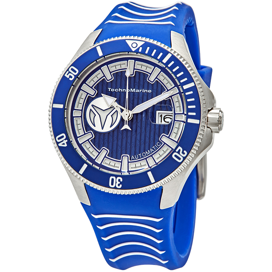 Silver-tone stainless steel case with a two-tone (blue and white) silicone strap. Uni-directional rotating oin edge blue top ring stainless steel bezel. Blue dial with silver-tone arrow-shaped hands and index hour markers. Minute markers around the outer rim. Dial Type: Analog. Luminescent hands and markers. Date display at the 3 o'clock position. SII Caliber NH35A Automatic movement, containing 24 Jewels, bitting at 21600 vph, and has a power reserve of approximately 41 hours. Scratch resistant flame fusion crystal. Pull / push crown. Transparent case back. Round case shape, case size: 47 mm, case thickness: 15.6 mm. Band width: 28 mm, band length: 8.75 inches. Buckle clasp. Water resistant at 100 meters / 330 feet. Functions: date, hour, minute, second. Cruise Series. Sport watch style. Watch label: Japan Movt. Technomarine Cruise Automatic Blue Dial Mens Watch TM-118012.