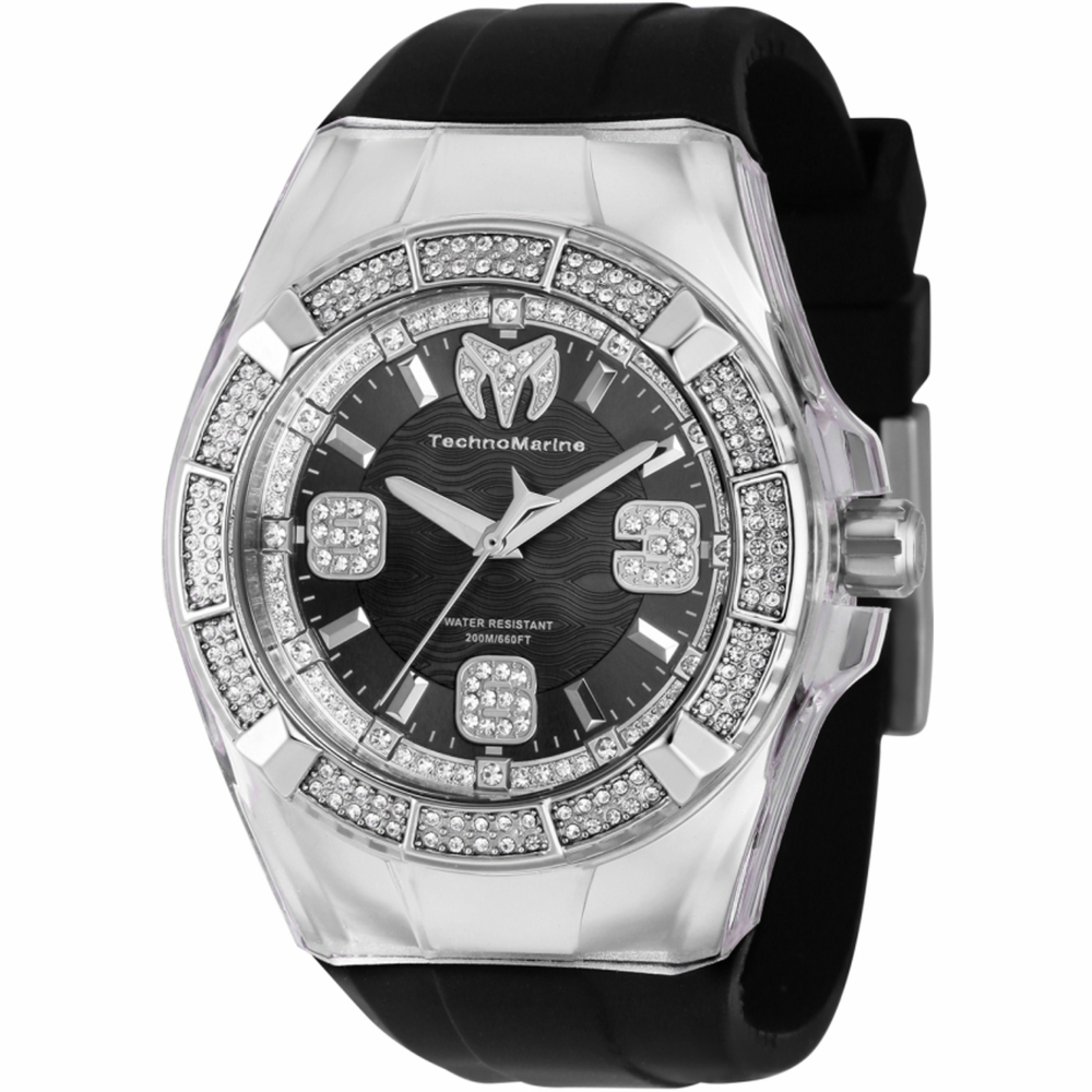 Silver-tone stainless steel case with a black silicone strap. Fixed silver-tone stainless steel set with crystals bezel. Black (crystal-set) dial with silver-tone hands and index hour markers. Crystal-set arabic numerals appear atthe 3, 6 and 9 o'clock positions. Minute markers around the outer rim. Dial Type: Analog. Ronda Caliber 763 quartz movement. Scratch resistant Flame Fusion crystal. Pull / push crown. Solid case back. Round case shape, case size: 44.5 mm, case thickness: 13.3 mm. Band width: 29 mm, band length: 8.25 inches. Tang clasp. Water resistant at 100 meters / 330 feet. Functions: hour, minute, second. Cruise Series. Casual watch style. Watch label: Swiss Movt. Technomarine Cruise Quartz Crystal Black Dial Mens Watch TM-121089.