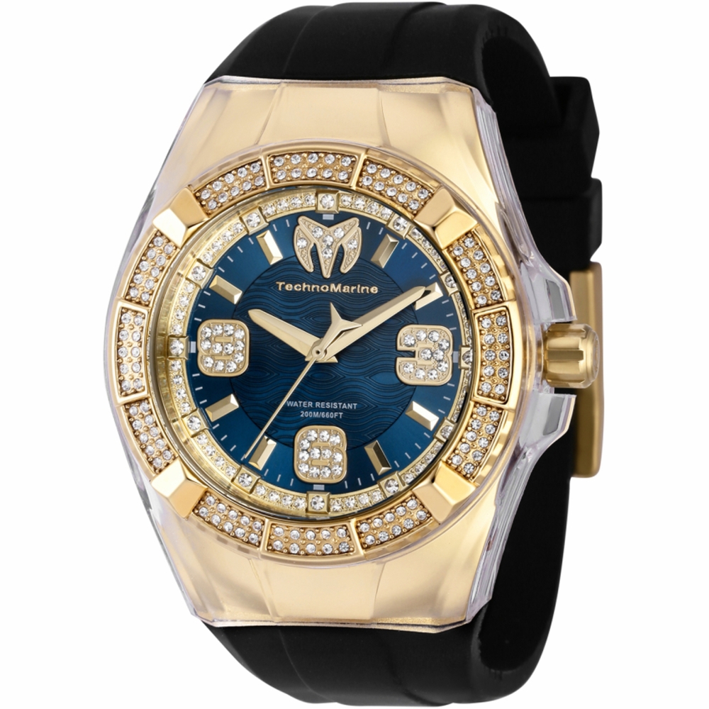 Gold-tone stainless steel case with a black silicone strap. Fixed gold-tone bezel set with crystals. Blue dial with index hour markers. Crystal-set Arabic numerals appear at the 3, 6 and 9 o'clock positions. Minute markers around the outer rim. Caliber 763 quartz movement. Scratch resistant Flame Fusion crystal. Pull / push crown. Solid case back. Round case shape. Case size: 44.5 mm. Case thickness: 13.3 mm. Band width: 29 mm. Band length: 8.25 inches. Tang clasp. Water resistant at 100 meters / 330 feet. Cruise Series. Technomarine Cruise Quartz Crystal Blue Dial Mens Watch TM-121094.