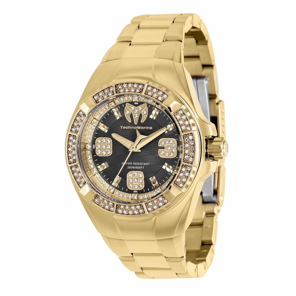 Gold-tone stainless steel case and bracelet. Fixed gold-tone bezel set with crystals. Black dial with gold-tone hands and index hour markers. Crystal-set arabic numerals appear at the 3, 6 and 9 o'clock positions. Minute markers around the outer rim. Dial Type: Analog. Caliber 763 quartz movement. Scratch resistant Flame Fusion crystal. Pull / push crown. Solid case back. Round case shape. Case size: 39 mm. Band width: 23 mm. Band length: 7 inches. Fold over clasp. Water resistant at 100 meters / 330 feet. Functions: hour, minute, second. Cruise Series. Dress watch style. Technomarine Cruise Quartz Crystal Black Dial Ladies Watch TM-121112.