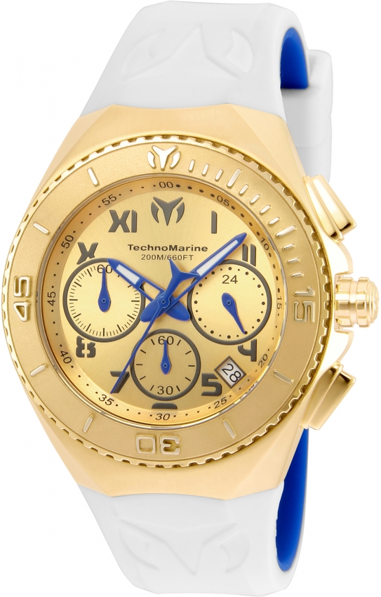 Gold-tone stainless steel and 14k yellow gold case with a white, blue silicone strap. Uni-directional rotating arabic numeral gold and steel stainless steel bezel. Gold-tone dial with blue skeleton dauphine-style shape hands and Arabic and Roman numeral hour markers. Minute markers around the outer rim. Dial Type: Analog. Luminescent hands. Date display between 4 and 5 o'clock position. Chronograph - sub-dials displaying: three - 60 second, 60 minute and 24 hour. Hattori Caliber VD53 quartz movement. Scratch resistant mineral crystal. Pull / push crown. Solid case back. Round case shape, case size: 40 mm, case thickness: 12.5 mm. Band width: 25 mm, band length: 7.25 inches. Pin buckle clasp. Water resistant at 200 meters / 660 feet. Functions: chronograph, date, GMT, second time zone, hour, minute, second. Sport watch style. Watch label: Japan Movt. Technomarine Cruise Chronograph Quartz Gold Dial Mens Watch TM-215079.