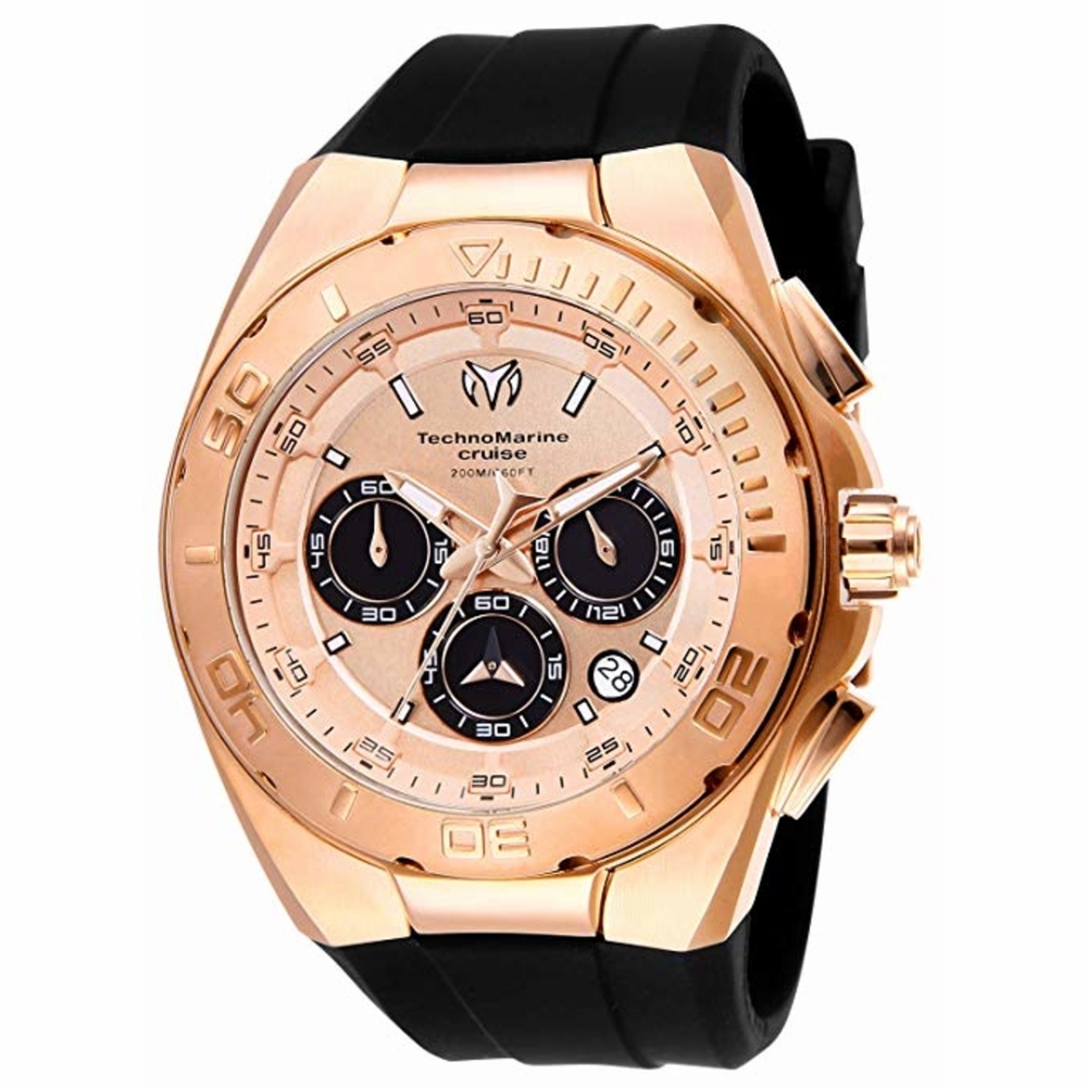 Rose gold PVD stainless steel case with a black silicone strap. Uni-directional rotating rose gold PVD bezel. Rose dial with luminous rose gold-tone hands and index hour markers. Arabic numeral minute markers (at 5 minute intervals). Minute markers around the outer rim. Dial Type: Analog. Luminescent hands and markers. Date display between the 4 and 5 o'clock positions. Chronograph - three black sub-dials displaying: 60 second, 60 minute and 24 hour. ISA caliber 6371D quartz movement. Scratch resistant mineral crystal. Screw down crown. Solid case back. Round case shape. Case size: 45 mm. Case thickness: 13.9 mm. Band width: 29 mm. Band length: 8.25 inches. Tang clasp. Water resistant at 200 meters / 660 feet. Functions: chronograph, date, GMT, second time zone, hour, minute, second. Cruise Series. Sport watch style. Watch label: Japan Movt. TechnoMarine Cruise Chronograph Quartz Rose Dial Mens Watch TM115346.