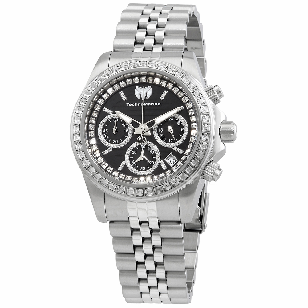 Stainless steel case with a stainless steel bracelet. Fixed stainless steel bezel set with crystals. Black (crystal-set) dial with luminous silver-tone hands and crystal index hour markers. Dial Type: Analog. Luminescent hands. Date display between the 4 and 5 o'clock positions. Chronograph - three sub-dials displaying: 60 second, 60 minute and 24 hour. Hattori caliber VD53 quartz movement. Scratch resistant mineral crystal. Screw down crown. Solid case back. Round case shape. Case size: 39.5 mm. Case thickness: 13.1 mm. Band width: 20 mm. Band length: 8 inches. Deployment clasp. Water resistant at 200 meters / 660 feet. Functions: chronograph, date, GMT, second time zone, hour, minute, second. Manta Series. Sport watch style. Watch label: Japan Movt. Technomarine Manta Chronograph Quartz Black Dial Unisex Watch TM-221013.
