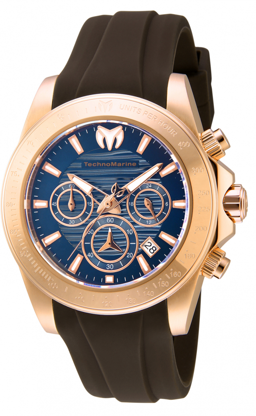 Rose gold-tone stainless steel case with a brown silicone strap. Fixed rose gold-tone stainless steel bezel. Blue dial with rose gold-tone hands and index hour markers. Minute markers around the outer rim. Dial Type: Analog. Luminescent hands and markers. Date display between 4 and 5 o'clock position. Chronograph - three sub-dials displaying: 60 second, 60 minute and 24 hour. Hattori Caliber VD53 quartz movement. Scratch resistant sapphire crystal. Screw down crown. Solid case back. Round case shape, case size: 42 mm, case thickness: 13.1 mm. Band width: 22 mm, band length: 7.75 inches. Pin buckle clasp. Water resistant at 200 meters / 660 feet. Functions: chronograph, date, GMT, second time zone, hour, minute, second. Manta Series. Sport watch style. Watch label: Japan Movt. Technomarine Manta Chronograph Quartz Blue Dial Ladies Watch TM-219039.